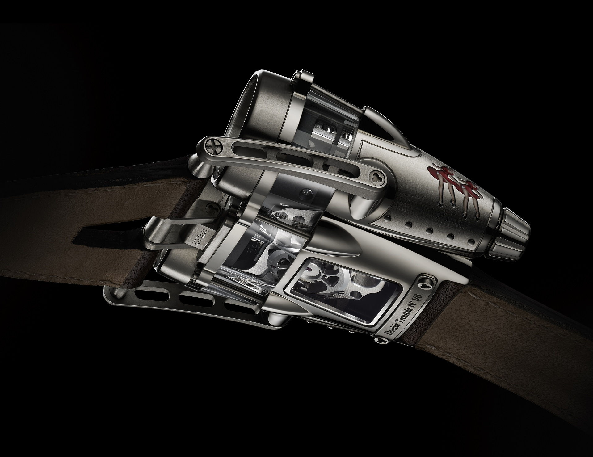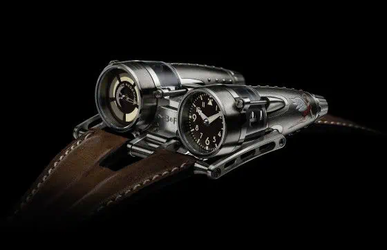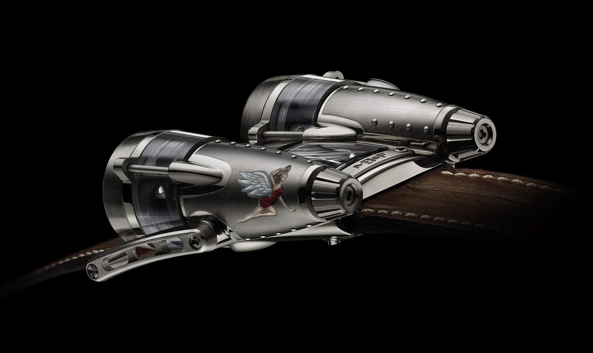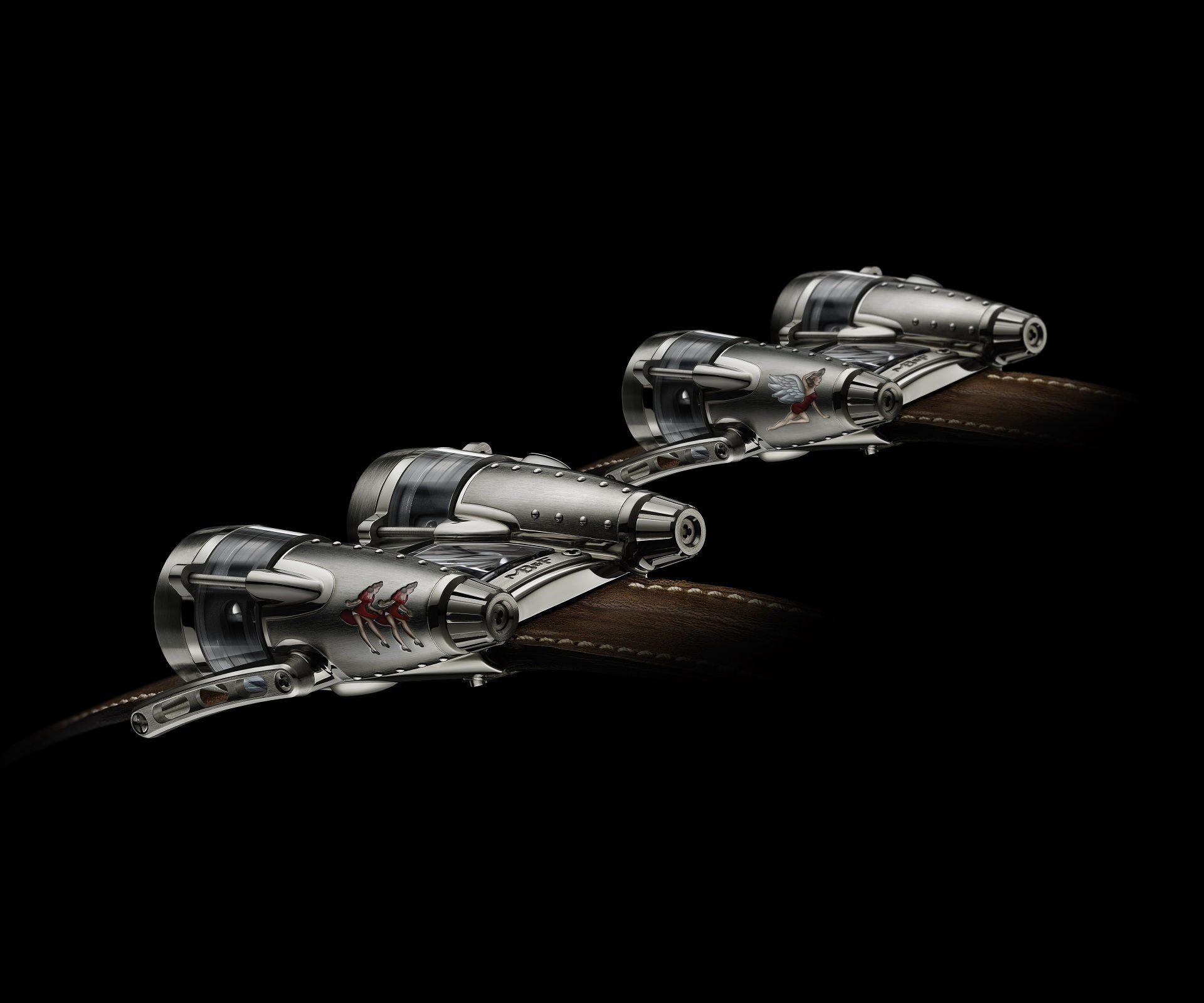 The original HM4 Thunderbolt was designed to show Max Busser’s love of vintage airplanes and the two limited edition timepieces (only 8 of each version will be produced) take the airplane concept a few steps further by adding vintage pinup art, titanium rivets on the “fuselage”, and vintage bomber jacket inspired brown leather straps.