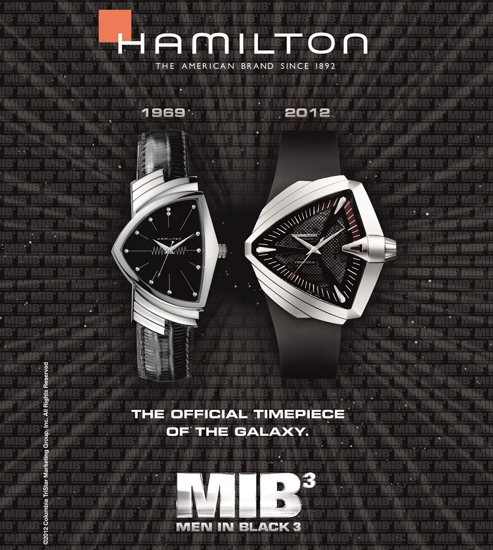 The third installment in the Men In Black franchise will be hitting theaters on May 25, 2012 and like the first two movies, Hamilton watches will be worn by Agent J and K. In the movie, Agent J will be wearing the Hamilton Ventura XXL and when he travels back in time (15 years to be exact) to save Agent K, Hamilton Ventura Medium will make an appearance.