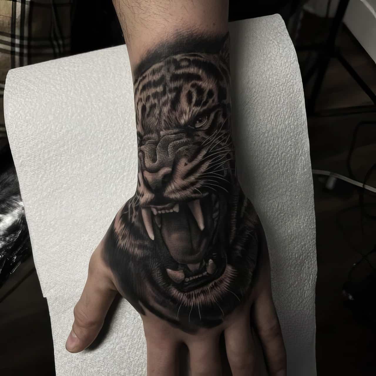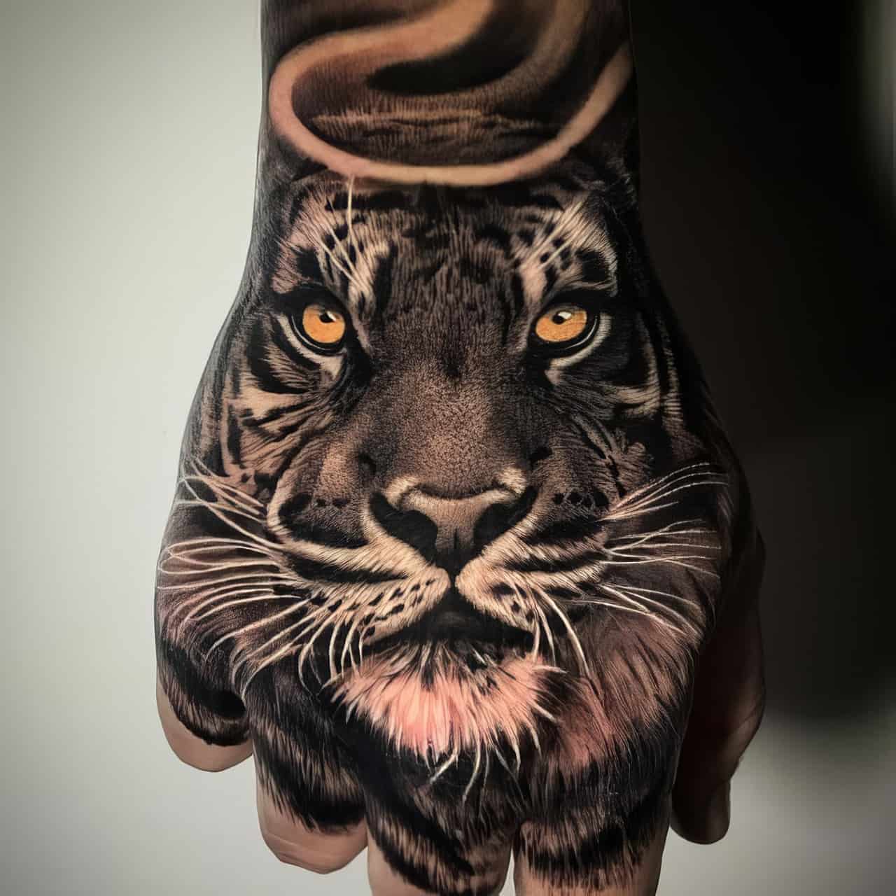 Shifting gears from the simplicity of small designs, tiger tattoos pack a punch. They show off strength and masculinity. With their bold stripes and fierce gaze, these inked beasts can cover a large area like your back or sleeve.
