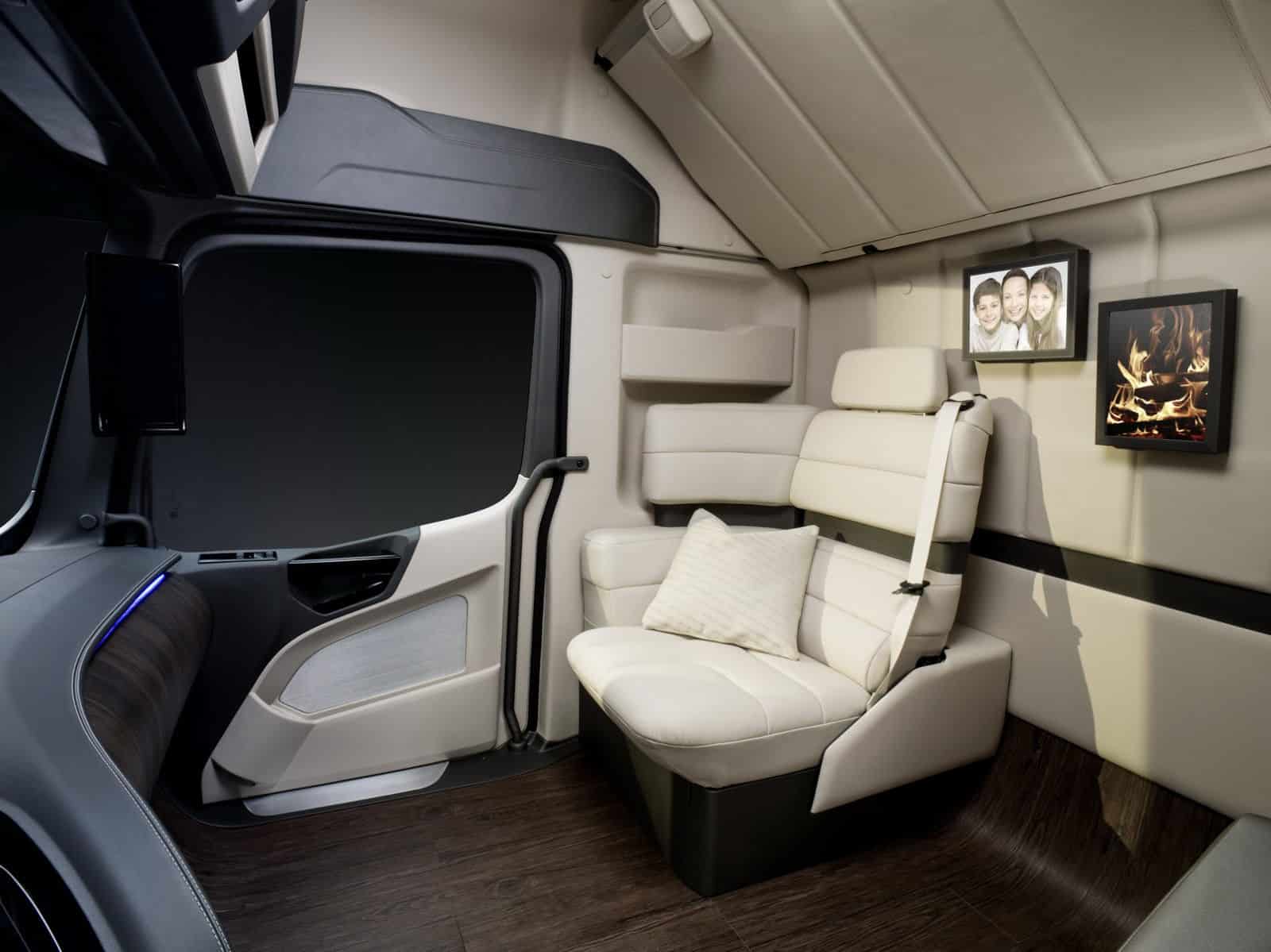 The design of the Mercedes-Benz Future Truck 2025 is certainly futuristic looking with soft lines, a massive Mercedes emblem, and very unique LED bulbs which illuminate the front end of the truck. The LED lights change from white to blue when the driver is in the autonomous mode. The truck also features a very spacious cabin which features the captain’s seat which is close to the steering wheel while the passenger’s luxurious looking seat is situated in the back right corner of the cabin.