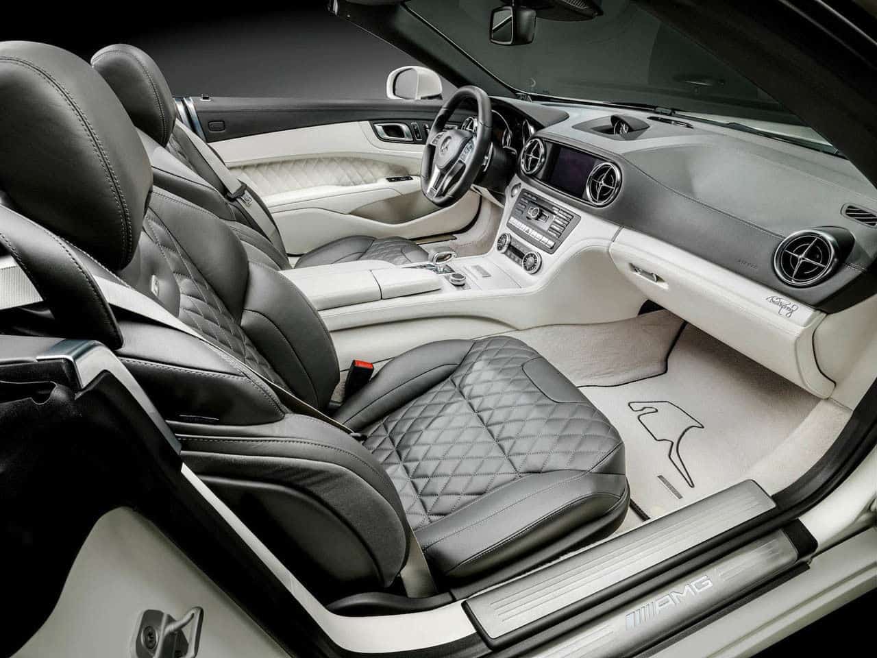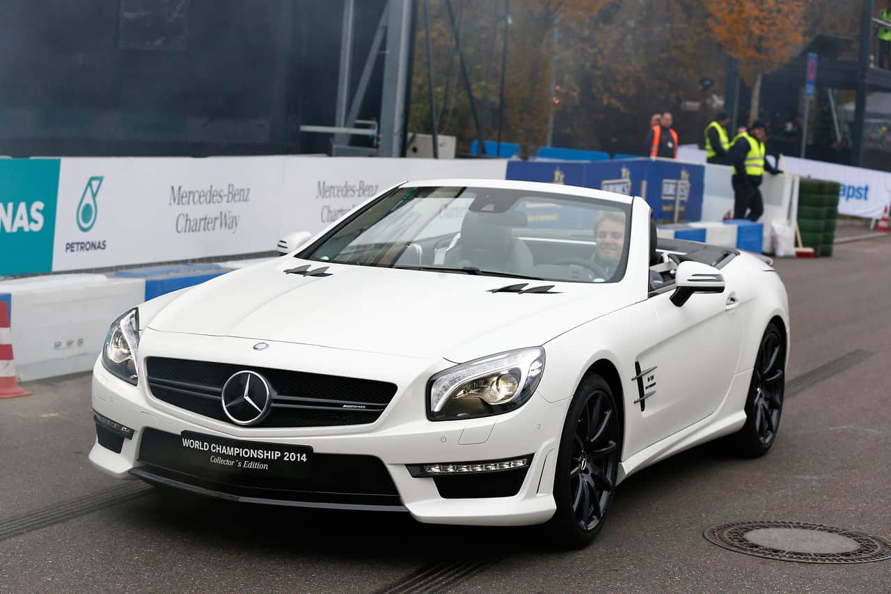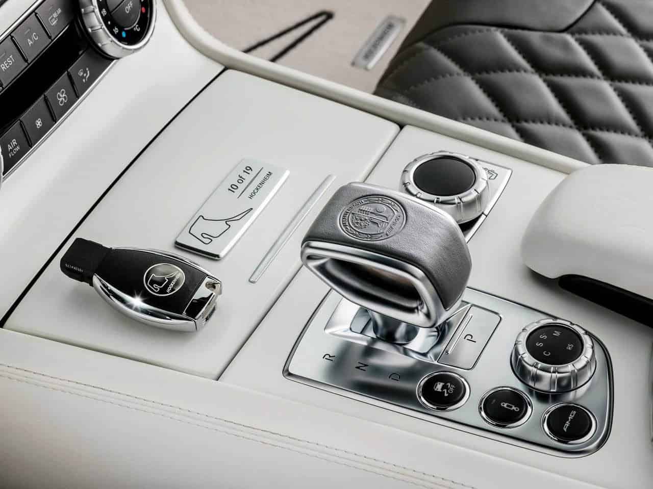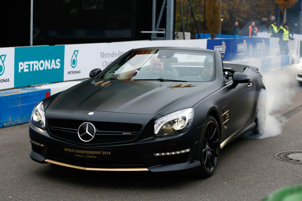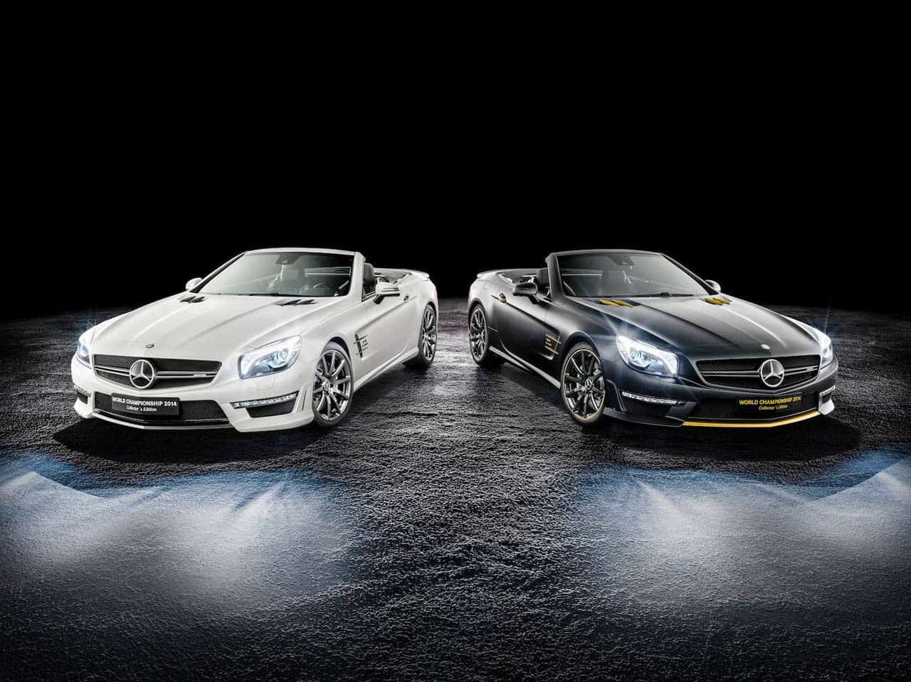 To celebrate this historic season, the German car maker is offering limited edition Mercedes-Benz SL63 AMG Championship Edition cars. The cars have been designed by Lewis Hamilton and Nico Rosberg; the black with gold highlights is Lewis’ championship winning car and the white with silver highlights is Nico’s second place finishing car. I don’t think the cars’ exterior color finishes have anything to do with the driver’s skin color ;).