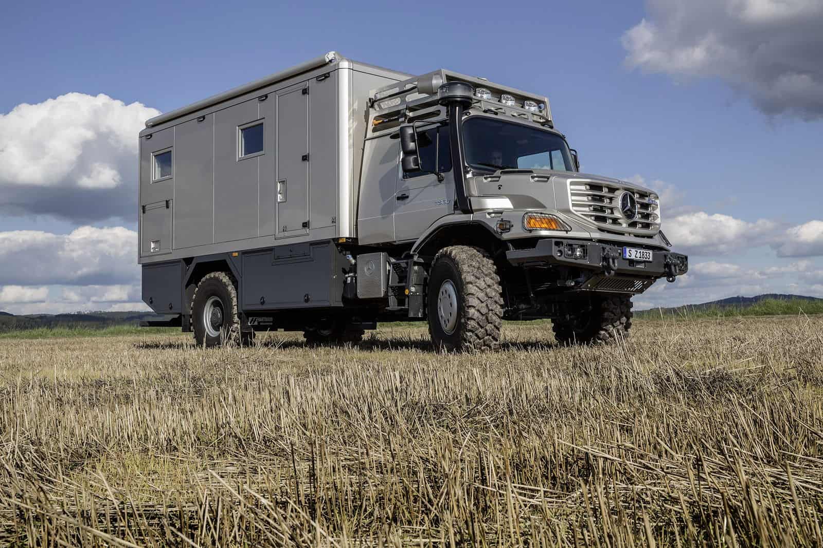 The 100mm thick walls, roof, and floor area all made out of a one-piece galvanized and plastic coated panels. Another highlight on the Zetros mobile home is the electric-powered carbon fiber slide-out which increases the living space by 2.5-meters. The interior of the Zetros has Mercedes-Benz quality written all over it. The living quarters features an L-shaped seating arrangement, a kitchenette, a bathroom with a shower, and a double bed to complete the picture. The kitchen counter and floor are finished in stone and wood veneer can be found throughout the interior of the mobile home. Lighting in the RV is provided by LEDs. The Zetros also comes equipped with its own satellite dish and built-in internet connection so you can stream movies and enjoy the on-board Bose sound system and LED TV.