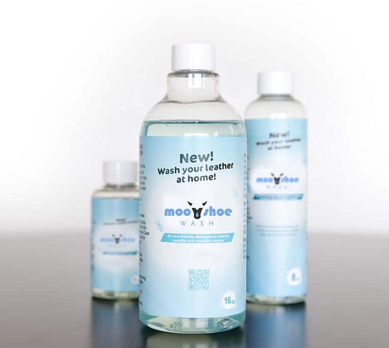 Moo Shoe Wash takes care of these chemicals by utilizing a combination of ingredients, a major one being coconut extract, to wash away the bacteria. Ingredients like dimethyl silicione and polyoxyethylene alkyl ether act as emulsifiers of the process providing protection and conditioners to insure the leather stays protected. The ingredients mix with water to form a leather-safe environment for washing leather shoes.