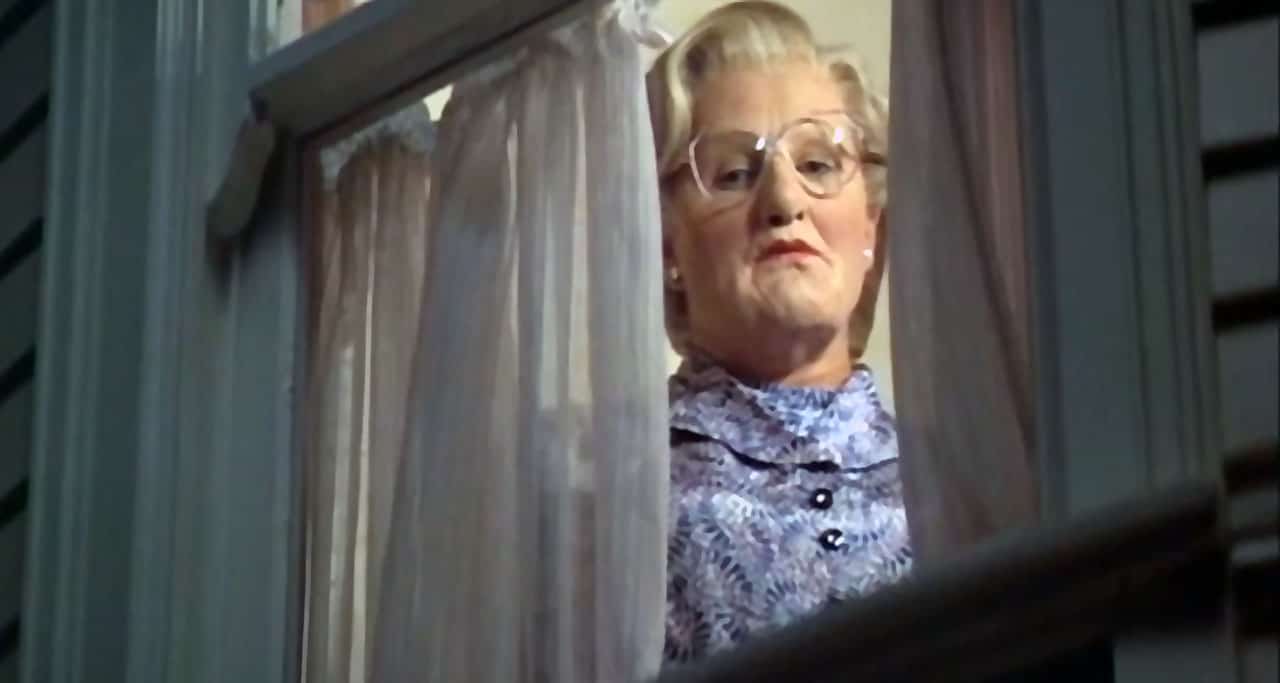 What really nailed it for me was just how serious the film becomes with a little bit of creative scene changes and foreboding music. It’s a stark and completely hilarious contrast to the original, which most of you have undoubtedly seen, either in full, or in part while someone’s kids were watching it. Where the original was hopeful and heartwarming, this one paints Daniel Hillard as a sick and twisted monster, sneaking into his former home for all manner of nefarious reasons. Creepy!
