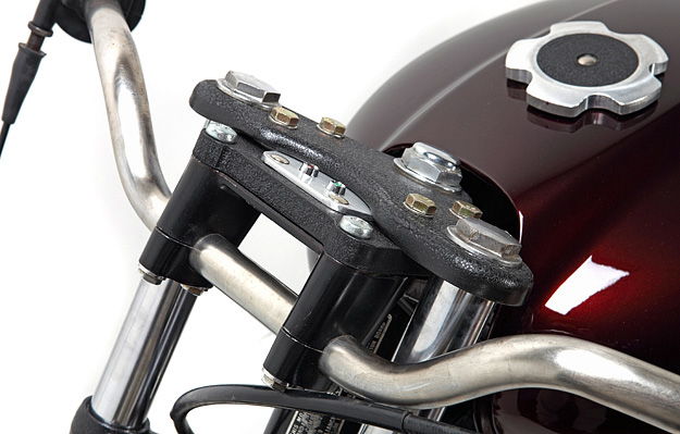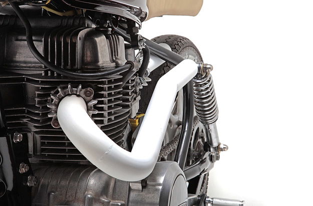 The back of the bike was chopped off and a new shorter suspension was put in, lowering the custom bike by 6 inches (175 mm) in the back. The fuel tank was reshaped and the front forks were raked forward to make the bike longer and give it the classic chopper look. The handle bars were mounted under the top bridge, foot pegs were set further back, and a new and very unique looking exhaust was placed high under the seat. The end result is a custom motorcycle that I want to take for a ride, it looks small and nimble and unique enough to make it to the Unfinished Man’s Christmas wish list.