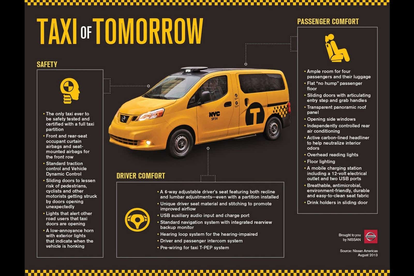 The Nissan NV200, Taxi of Tomorrow, is finally ready for production after two years of development and street trials. The taxi will be manufactured in Mexico and it promises to improve passenger experience with more interior space, additional safety, efficiency, and technology. Too bad lower fares aren’t one of its promises because I know that would be welcomed with open arms by New Yorkers.