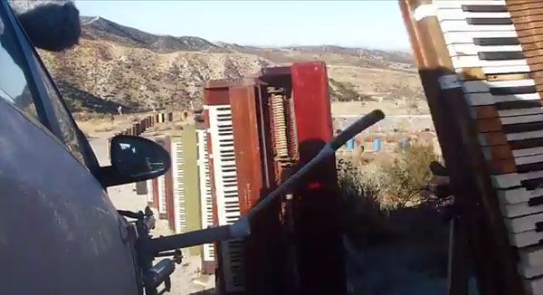OK Go set up over 1000 instruments over two miles of desert outside Los Angeles. A Chevy Sonic was outfitted with retractable pneumatic arms designed to play the instruments, and the band recorded this version of Needing/Getting, singing as they played the instrument array with the car. The video took 4 months of preparation and 4 days of shooting and recording. There are no ringers or stand-ins; Damian took stunt driving lessons. Each piano had the lowest octaves tuned to the same note so that they’d play the right note no matter where they were struck.