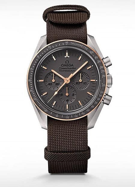The Apollo 11 45th Anniversary watch is quite striking; with a 42 mm titanium case and 18k Sedna gold bezel, hands, and hour indices. The black PVD dial (looks brown to me) has been laser engraved and features three sub-dials for the chronograph. The watch sits on a brown NATO strap, matching the dial.
