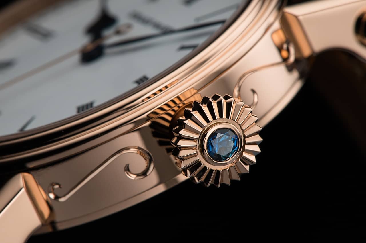 The one-off watch is based on the Resilience watch; for the auction, it comes in a beautiful Piccadilly 18k rose gold case measuring 38 mm. The dial is finished in white enamel, which doesn’t tarnish over time. The dial is very clean looking with black Roman numerals, blue steel hour and minute hands, and 18k rose gold second hand. The crown is also set apart from a regular Resilience watch, it is set with a 0.2 carat blue sapphire, which matches the blue hands.