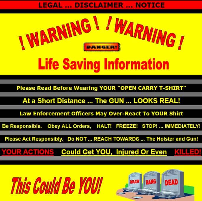 The 3D image is designed to look realistic and most people will likely run in the opposite direction after seeing you. There are a lot of YouTube videos of pranks on police officers but I don’t think anyone will likely be volunteering for this social experiment. You know there is potential for danger when the Open Carry T-Shirt comes with a disclaimer “At a short distance, the gun looks real! Law enforcement officers may overreact to your shirt. “Obey all orders. Halt! Freeze! Stop! Immediately! Do not reach towards the holster and gun.”