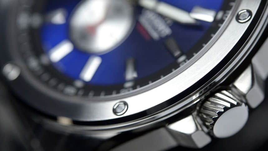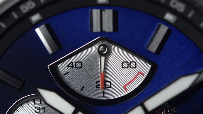 This, new for 2013, watch has an elegant look with a bit of toughness; I think the lugs on the case give it that tough look. The case is brushed stainless steel, measuring 43.5 mm, with an eye catching blue dial. The sub-dials are finished in silver with red hands, which nicely offset the blue background.