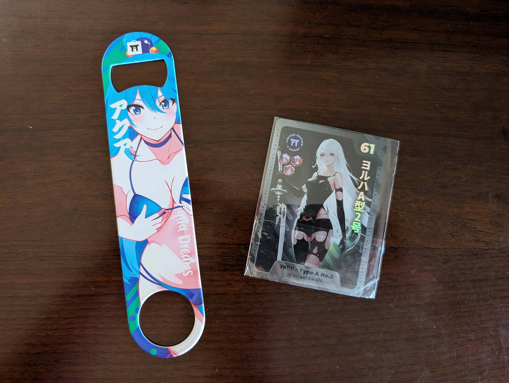 Two collectible cards complete the set: Waifu Card #61, starring A2 from Nier: Automata, and a shiny holographic Yura card. This collection mixes useful daily items with fun, anime-inspired collectibles, hitting that sweet spot for devoted otakus.
