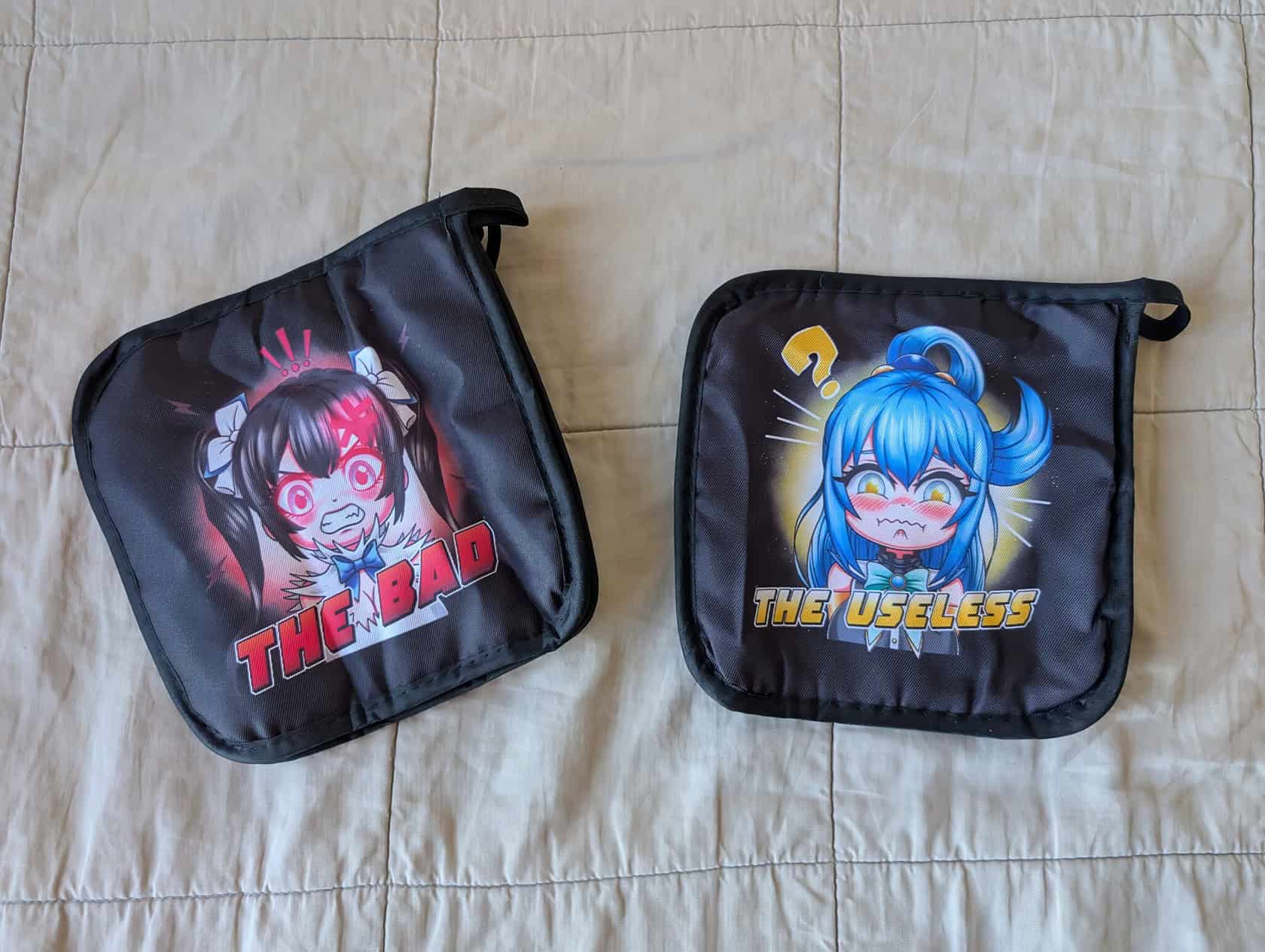 Plus, the anime-inspired hot pads add a playful touch, humorously titled “The Good, The Bad, and The Useless”, showcasing beloved characters Belladandy, Hestia, and Aqua.