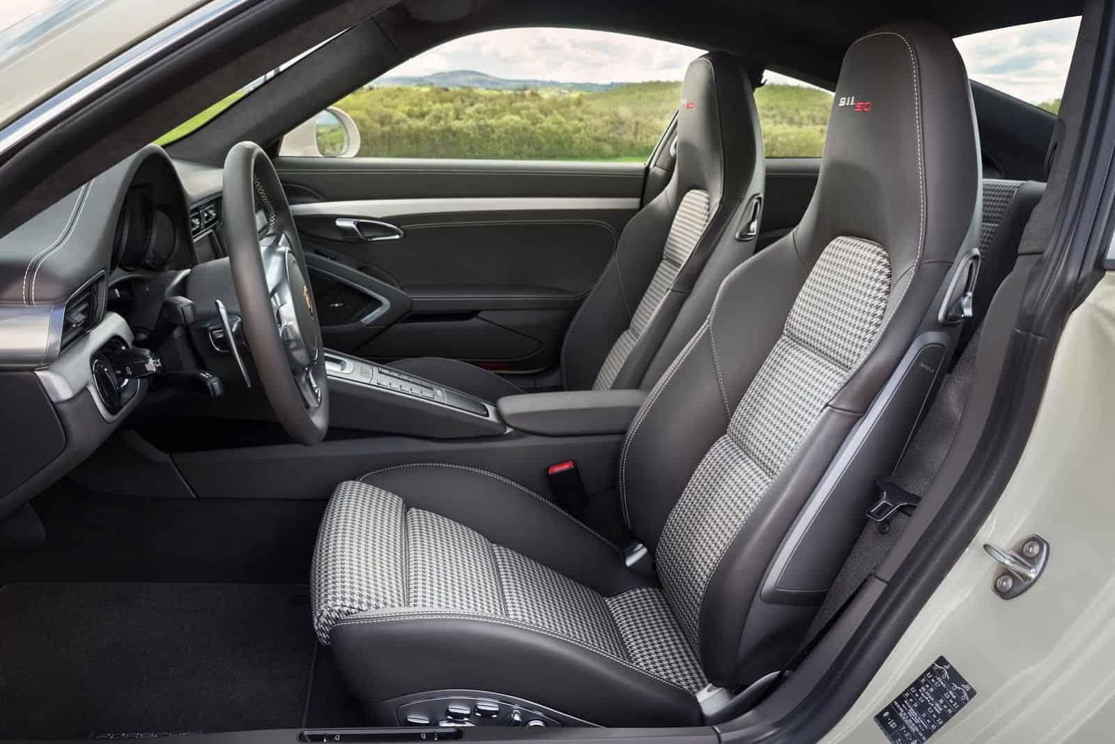 The retro-themed 911 Carrera S 50 Years Edition comes with special paint schemes, a Graphite Grey and Geyser Grey metallic. The one pictured in this post looks very retro, reminds me of an old refrigerator from the 1960’s. The rear deck features “911 50” badge and the car sits on retro looking 20” wheels. The interior also has a bit of retro-flavor to it with the center part of the seats covered in cloth, the cloth looks like it was used as curtains in a house in the 60’s. The headrests have “911 50” stitched on them and the gauges feature green numbers with white needles.