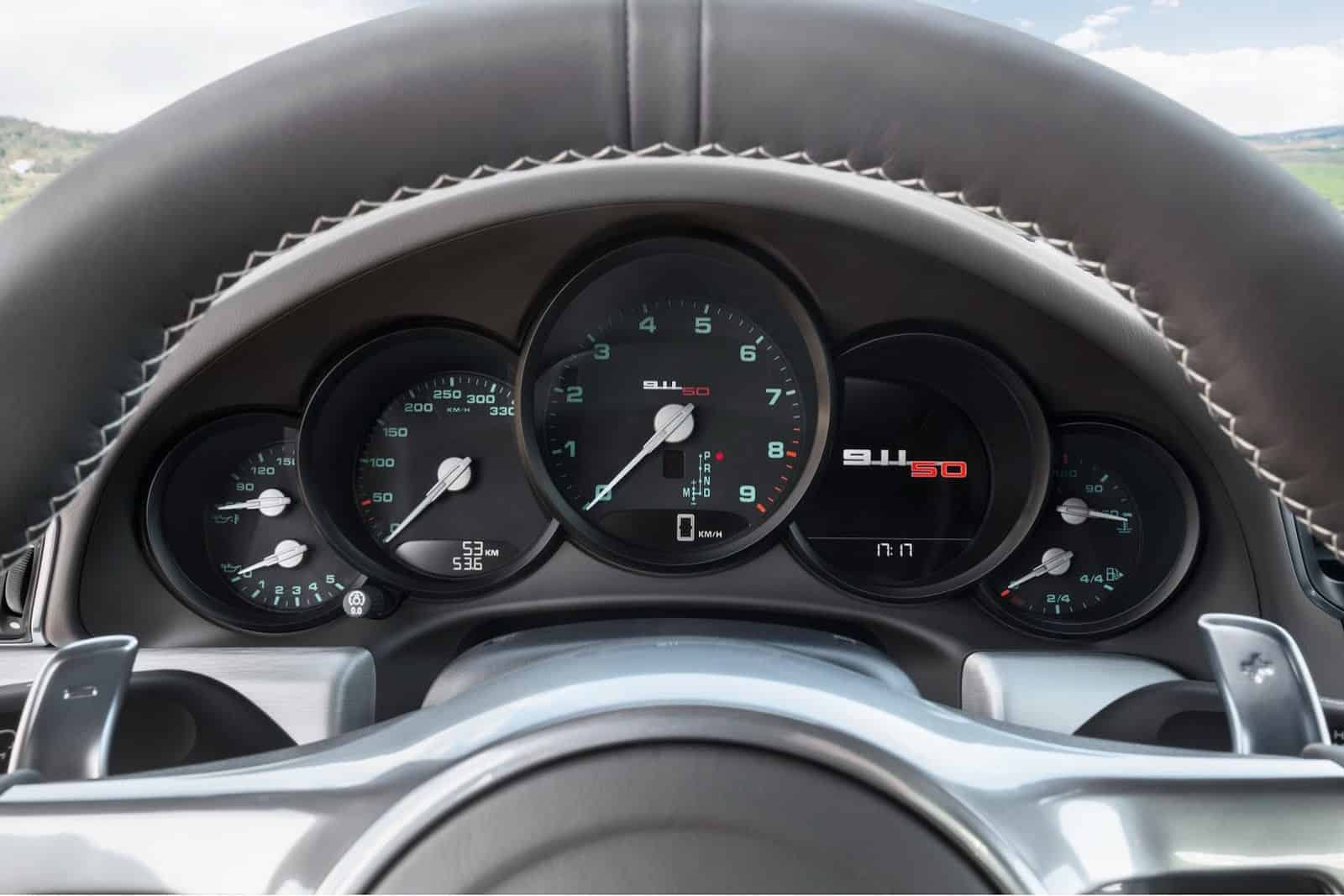 The Porsche 911 Carrera S 50 Years Edition is equipped with a sports exhaust and newly tuned Porsche Active Suspension Management system to cope with the wider body. The cars will be available in September with prices in the UK starting at £92,257. Via: Porsche