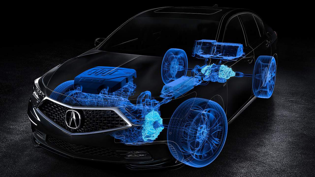 The three-electric motor system is like what the Acura NSX supercar uses. There is one 37 kilowatt (47 HP) motor mounted at the front, integrated into the transmission. This motor powers the front wheels when extra power is needed, it also regenerates electricity during braking/deceleration, and charges the lithium-ion ion batteries during normal driving. The other two motors, 27 kw (36 HP), providing power to the rear wheels and managing the electric torque-vectoring, these motors also regenerate electricity during braking/deceleration.