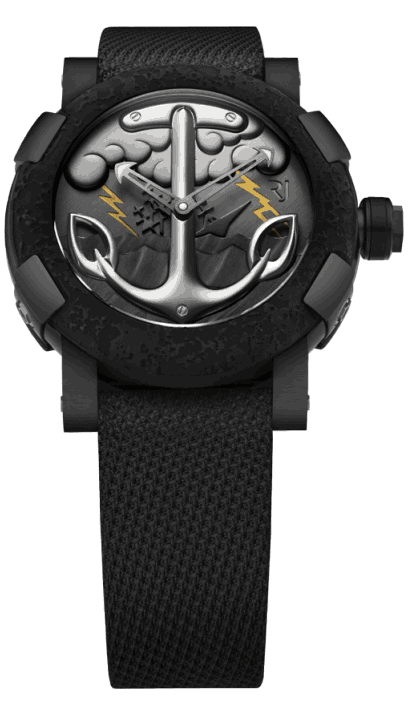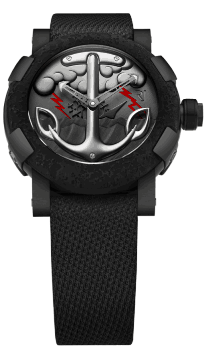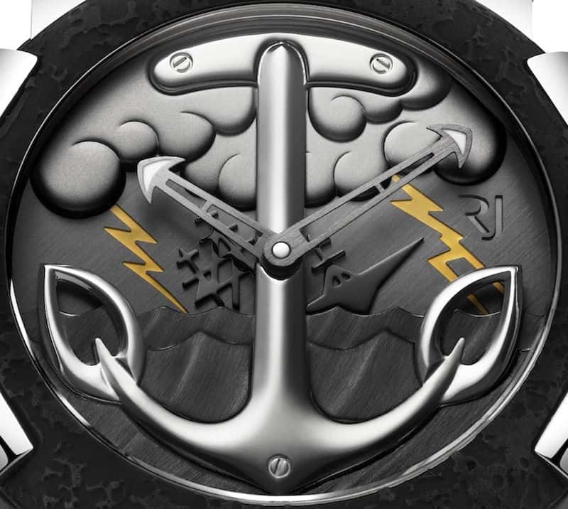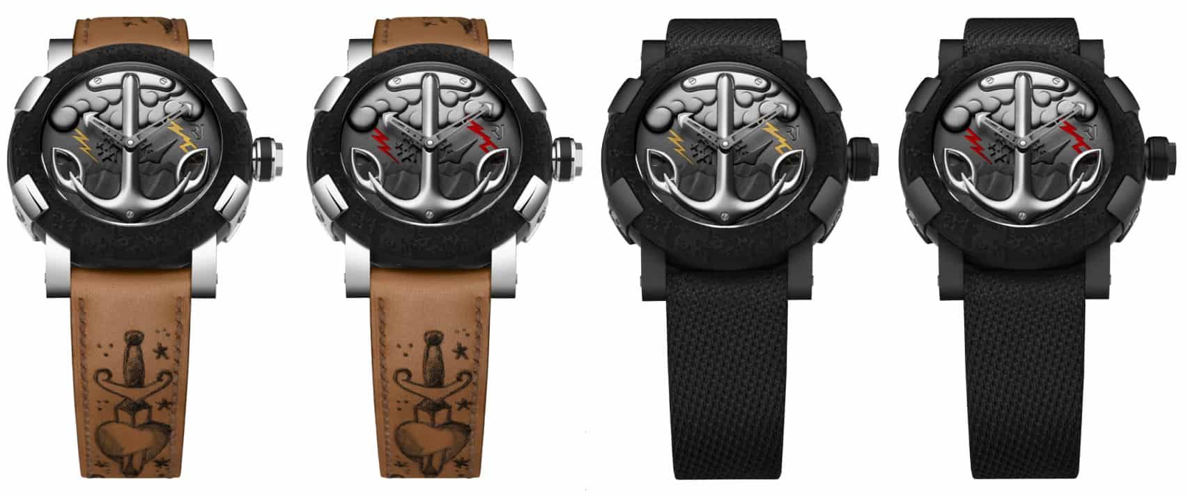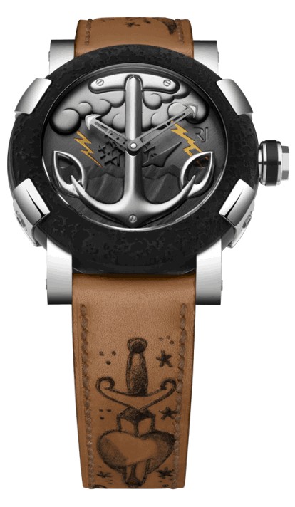 The Tattoo-DNA watches will come in four varieties and each will be limited to 25 pieces. The watches come in the same case seen on most of the RJ watches we’ve written about recently, and it measures 50 mm. The cases are PVD coated with half of them have stainless steel elements. The all-black watches come with black straps, and the other 50 come with skin colored straps with a tattoo of a heart with a knife through it.