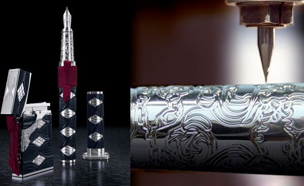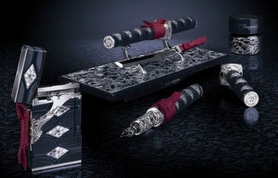 The pieces in the set are handcrafted from a solid piece of rose gold and include hundreds of small diamonds and textured leather trim with silk ribbon accents. The St. DuPont Samurai Prestige set will be produced in a limited number of 20 pieces at a price of $66,000.
