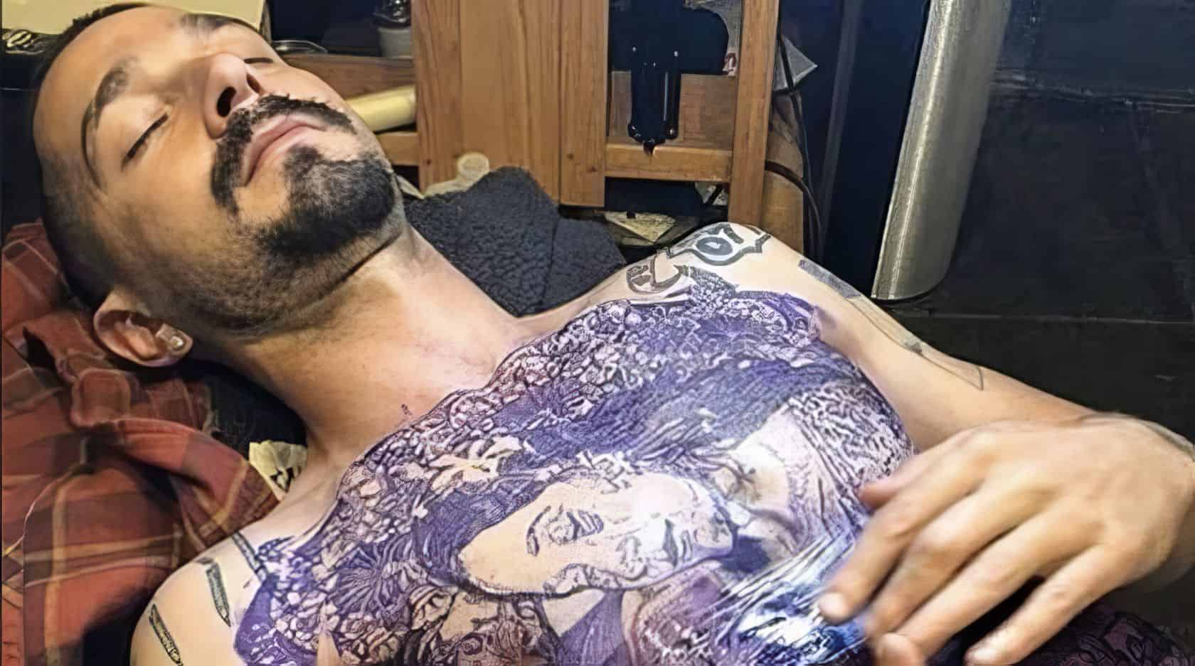 To play the character Creeper in the 2020 film The Tax Collector, he decided that fake ink wasn’t enough. He connected with tattoo artist Bryan Ramirez to create a permanent chest panel that would define the character forever.