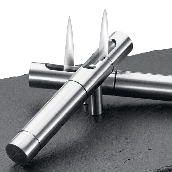 Unlike the gel fireplace from last month, the slate tabletop fireplace looks much easier to move from one location to another because of its weight. The fireplace comes with two metal pieces that look like over-sized pens or flutes, which sit atop a slate base. The 7.5” long flute-looking things are supposed to represent fire logs and are made out of stainless steel, and they house the oil for the fire. The slate bottom measures 10” x 14” and ensures none of furniture burns, just in case the fire happens to escape the logs.