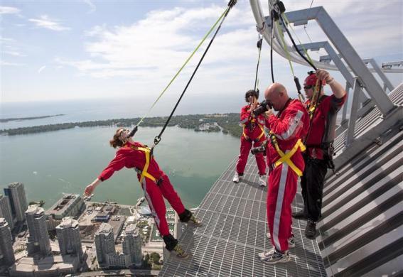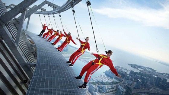 The EdgeWalk attraction opened up to the public on August 1st and is the world’s highest full circle hands-free walk on a 5 ft. wide ledge encircling the top of the Tower’s main pod. To be clear, this 5 ft ledge has no side rails! Thrill seekers get an opportunity to walk in groups of six while attached to an overhead safety rail via a trolley and harness system. The participants who are crazy enough are allowed to lean back over the edge with nothing but air and amazing views of Lake Ontario 1168 feet beneath them.