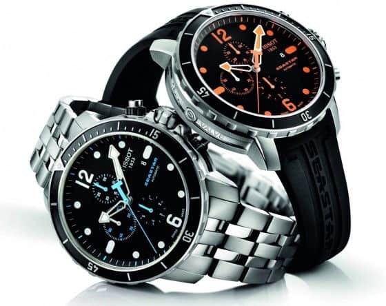 The Tissot Seastar 1000 Chronograph is powered by a Calibre C01.211 automatic movement and comes with a sapphire crystal, a unidirectional rotating bezel, and a helium release valve. The dial features three chronograph sub-dials and a date window at the three o’clock position. The watch is priced at $1,000 – $1,999.