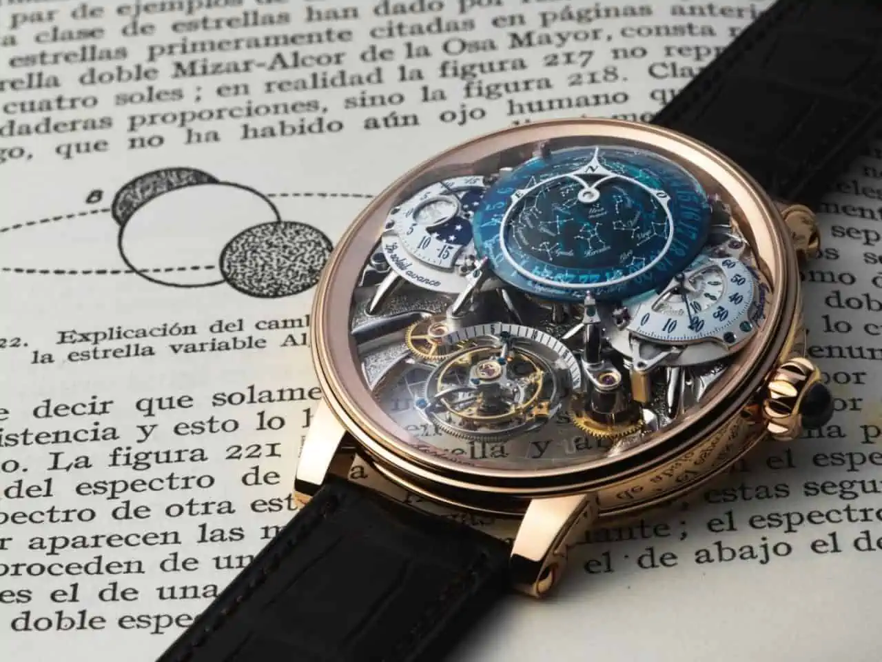 Brassus integrates a carousel minute repeater with transparent faces, a one-minute flying carousel to offer unparalleled presentation. Its case of 15-35 millimeters by 45 millimeters is 18-carat gold, added with a white grand feu enamel dial, and a brown alligator leather strap.