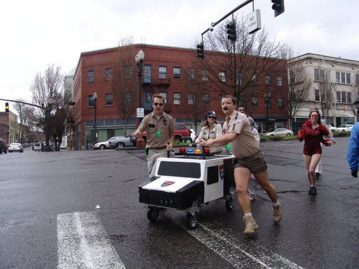 Yeah, this is actually a thing. A glorious, glorious thing founded originally in 1994 in San Francisco. However, I’m writing this article about the Portland Urban Iditarod since I’m trying to familiarize myself with it…. The UFM team is going to try to register for the 2012 race. In any case, if you’re looking for info on particular cities’ races, check at the bottom of this post. I’ve done my best to collect up links to different push-your-idiot-drunken-friends-around-in-stupid-costumes-trying-not-to-puke Idiotarods so you don’t have to go looking yourself.