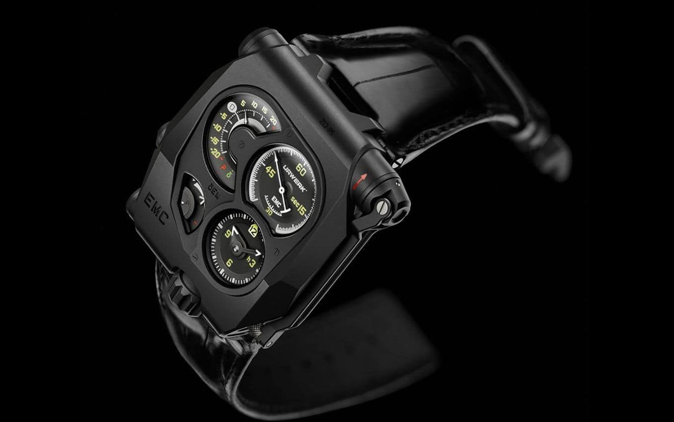 Now Urwerk has released a new version of the watch, called the EMC Black. This new version still comes in the same 41mm wide x 51 mm tall x 15.8 mm thick steel/titanium case, but now it has been DLC coated, giving the watch a more serious look. Other than the new exterior finish, nothing else has been added to the watch.