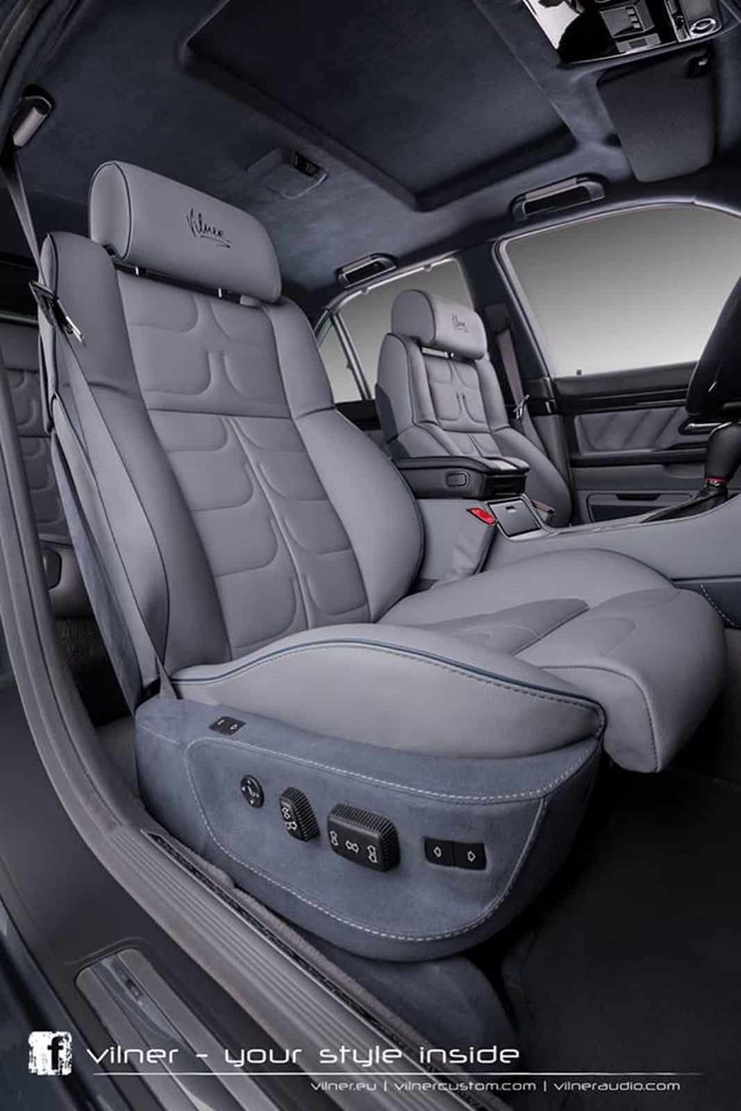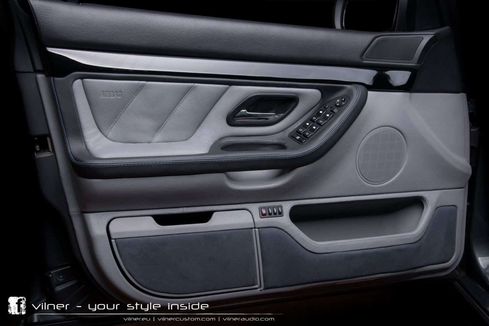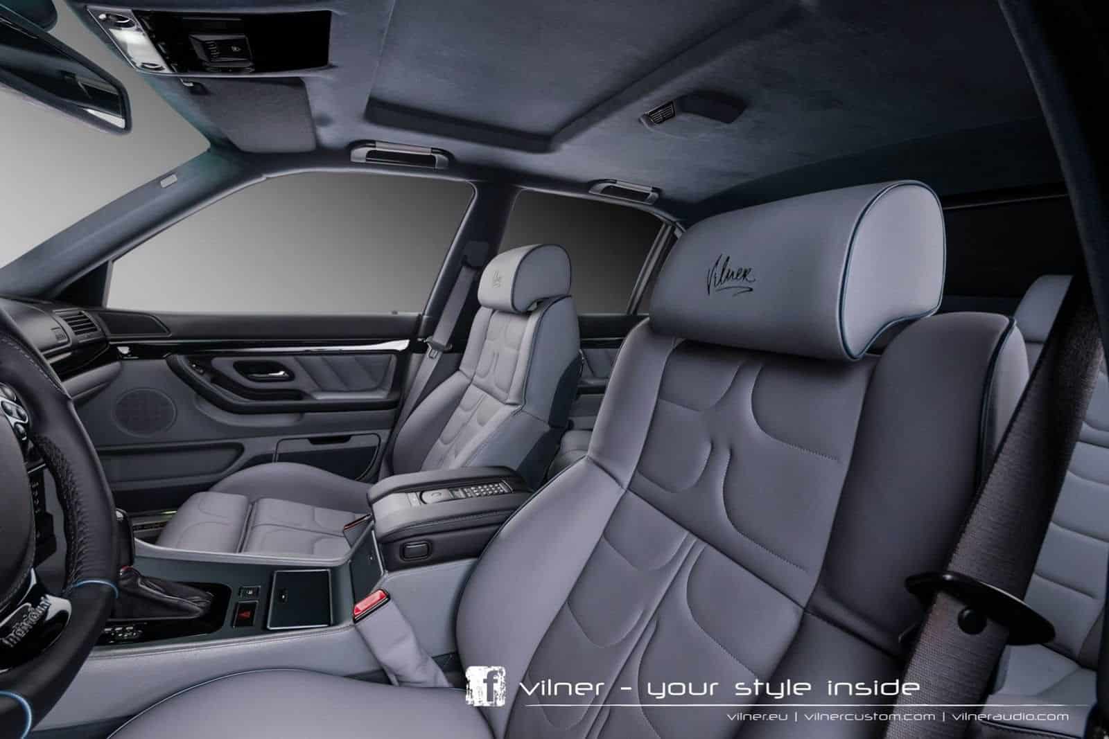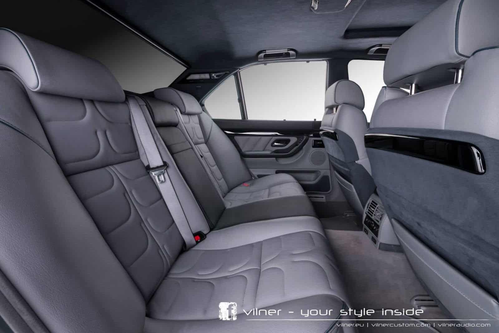 The Vilner tuned BMW 750i looks to be completely restored to new condition. The exterior features smoked headlights and taillights, and large 5-spoke black wheels. The interior has been completely redone with grey and black leather covering every inch of the car. Piano black wood trim has been applied to the dashboard, door panel trim, and back of the front seats. Alcantara has been applied to the headliner and parts of the seats.