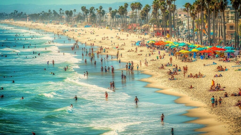 Santa Monica offers a 3.5-mile stretch of golden sand beach with volleyball courts, surfing, and stunning sunset views.