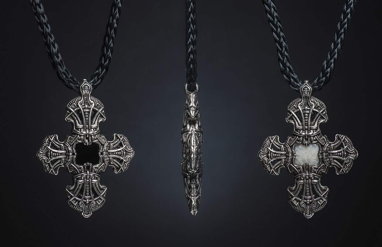 The P10 Necklace features a reversible sterling silver cross pendant that has been inlaid with onyx and fossil walrus tusk upon a thick braid of Kevlar. Defined by its symbolic cross, the P10 Necklace balances ancient symbolism with modern high fashion.