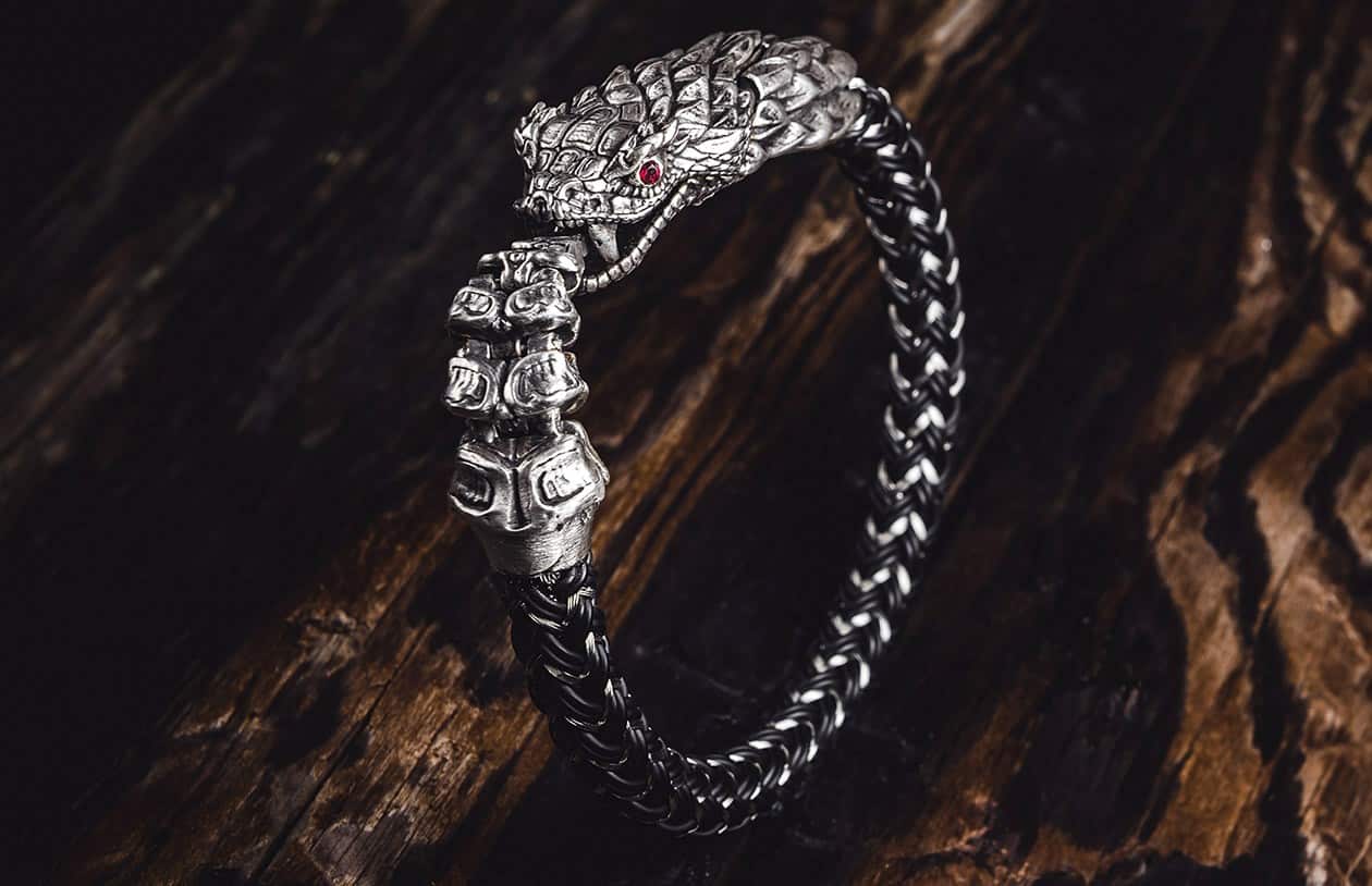 Featuring intricate detailing, the snakelike BR7 Full Circle Bracelet features a sterling silver head, hinge and spring loaded jaw, pinned and laser welded rattles on the tail, and red topaz eyes.